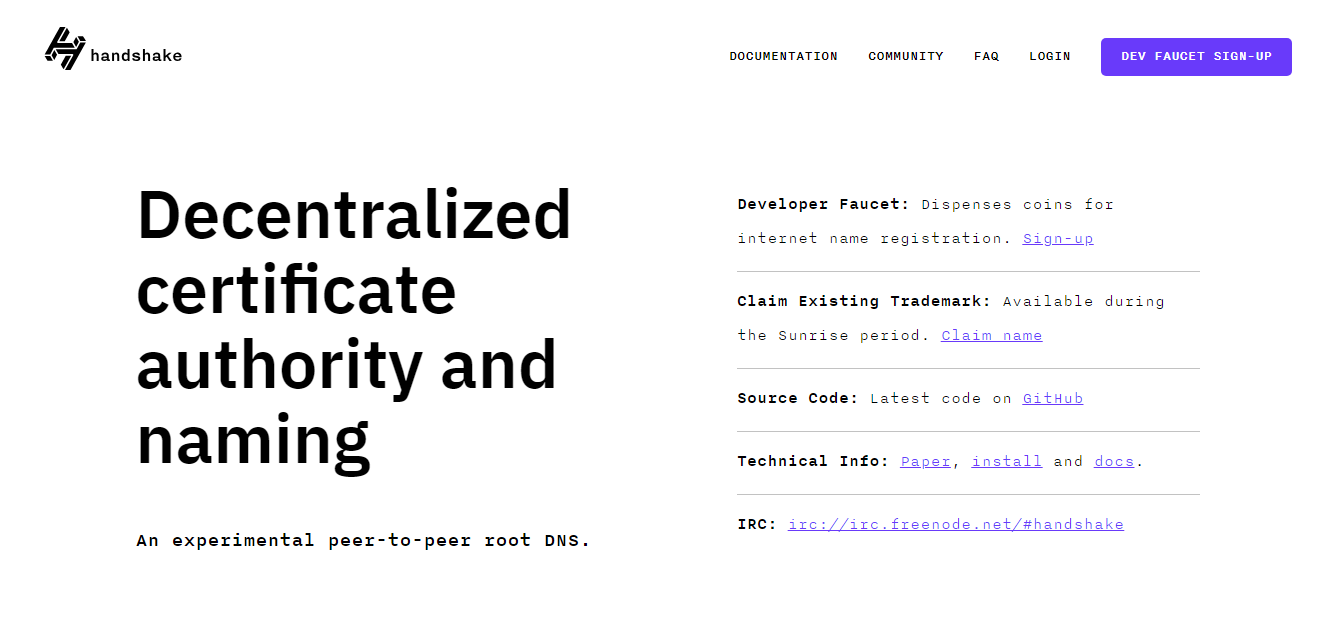 Handshake is not a company or a venture of any kind. It is a protocol, which aims to be completely decentralized and a democratic certificate authority and naming system. While it will offer itself as an alternative to current certificate authorities, it does not want to replace today’s DNS (Domain Name System).
