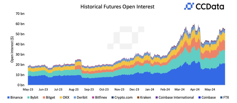 According to CCData’s report, During the wake of the Bitcoin Halving and BTC ETF events, the combined spot and derivatives trading volume on centralized exchanges declined by 20.1% to $5.27 trillion in May. However, open interest on derivatives exchanges surged by 30.5% to $55.2 billion. Against this backdrop, Bitget experienced a remarkable 39.2% increase in open interest, reaching $9.74 billion, solidifying its standing as a leading derivative exchange.