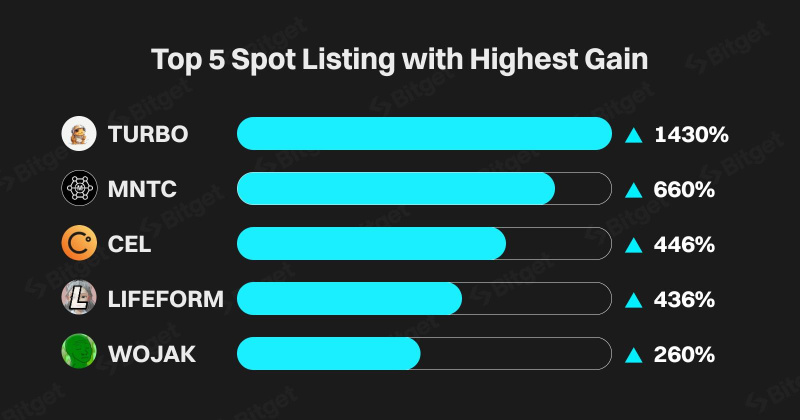 In May, Bitget significantly expanded its asset selection by listing 62 new tokens, driving notable interest and increased trading volumes. Among the top-performing additions, $TURBO, $MNTC, $CEL, $LIFEFORM, and $WOJAK saw impressive gains ranging from 260% to 1430%, demonstrating Bitget’s proactive approach to meet evolving market demands and highlighting the substantial potential for lucrative returns within its ecosystem.