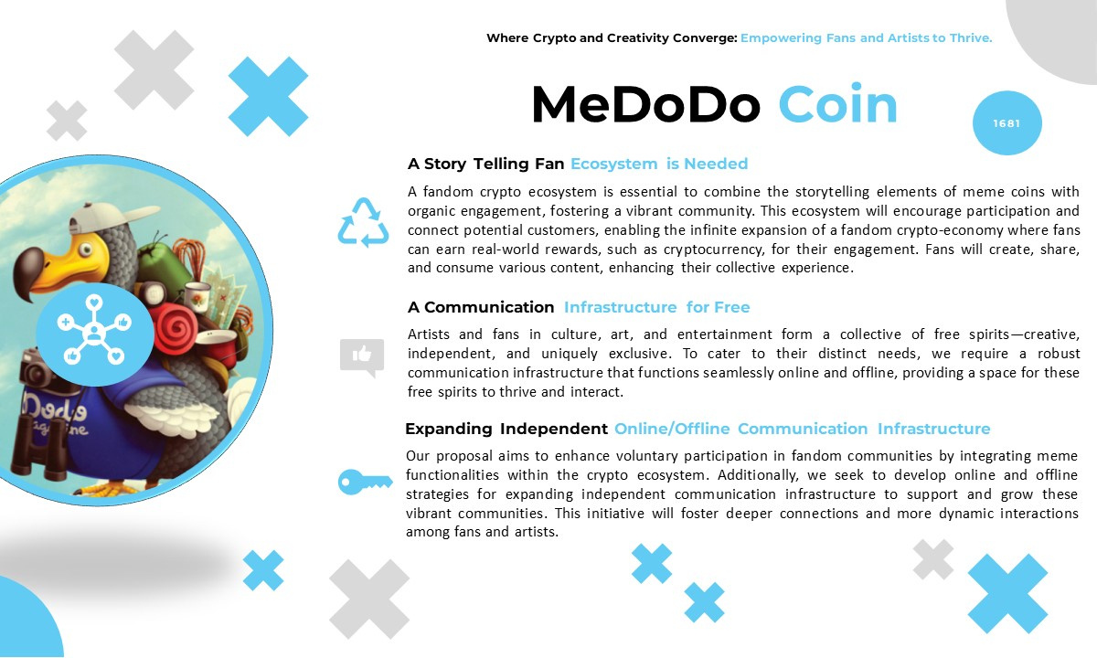 Historically, the Dodo Bird was known for its fearless and inquisitive nature, often following humans out of sheer fascination. Inspired by this behavior, the MeDoDo Coin symbolizes the unwavering love and support fans offer their favorite artists, mirroring the Dodo Bird’s curious devotion. The MeDoDo Coin operates on the BEP-20 standard. This unique cryptocurrency aims to create a vibrant ecosystem where fans can connect with and support their beloved artists in ground-breaking ways.