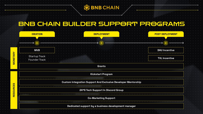 BNB Chain fosters impactful Web3 innovation with its BNB Chain Builder Support Program. This includes the MVB accelerator program, run in partnership with Binance Labs and CMC Labs.