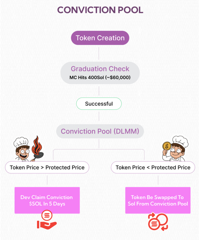 - Soft Price Protection: If the token graduates, the conviction pool will activate. If the price drops to a set level, users can swap their bought tokens into SOL from the conviction pool, acting like an insurance, establishing benchmarks for quality in the market. If the price does not fall below the set level, the developer can claim back the SOL from the conviction pool.