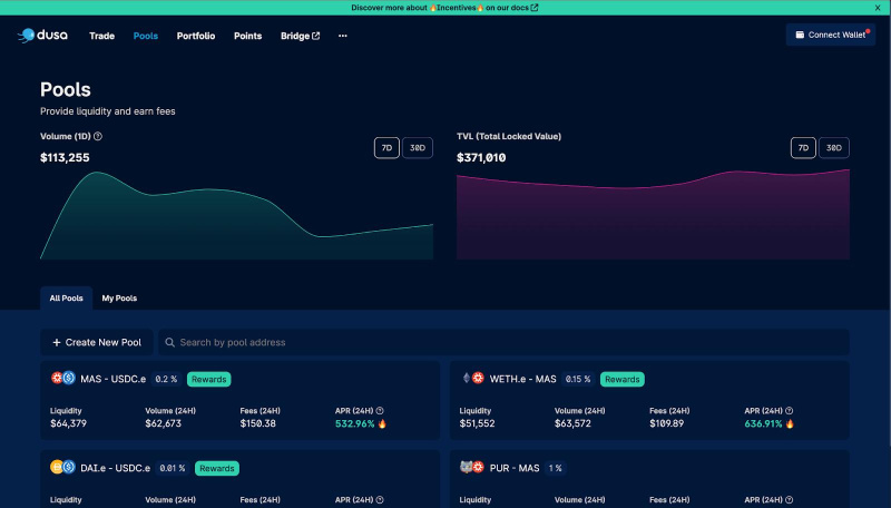 Dusa Labs provides users with a highly secure decentralized environment, offering features such as DEX swaps and advanced order options, including limit orders, trailing stops, dollar-cost averaging, and custom liquidity management strategies. The platform maintains a decentralized architecture, and its 100% on-chain structure gives developers a strong foundation for creating DeFi applications, prioritizing maximum security and decentralized principles.