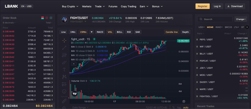 According to LBank data, the weekend market experienced a significant rebound following the Trump shooting incident, with the meme token FIGHT soaring to unprecedented heights. As of the time of writing, FIGHT is priced at $0.082464, reflecting a 24-hour increase of 519.64%.