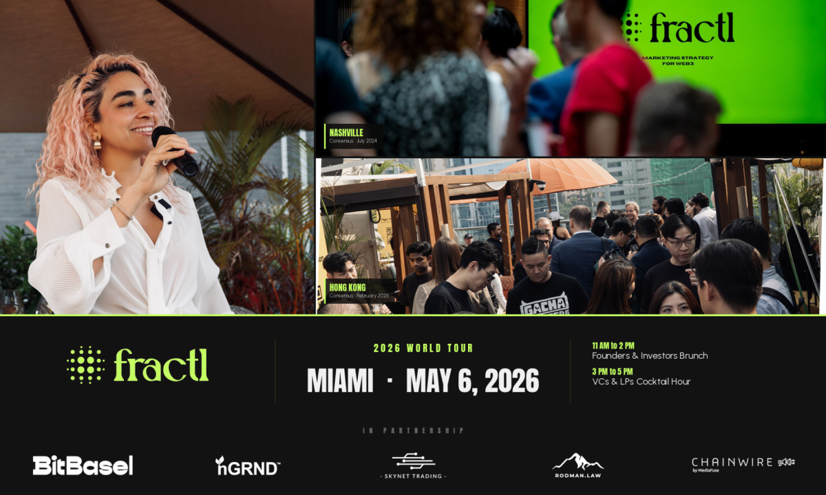 fractl, web3’s largest investor network connecting top tier founder and capital, today announced its Miami 2026 lineup: two invitation-only side events held during Consensus week. The exclusive Founders & Investors Brunch runs May 6 from 11am to 2pm. The private VCs & LPs Cocktail Hour runs the same day from 3pm to 5pm. Confirmed sponsors are Bitbasel, nGRND, Skynet Trading, The Rodman Law Group, and Chainwire.