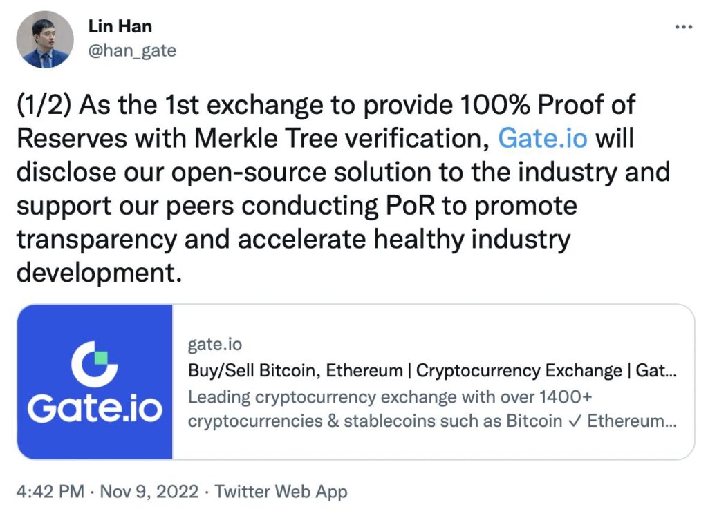 The cryptocurrency exchange Gate.io has made its Merkle Tree Proof of Reserves solution open-source. Announced by Gate.io’s Founder and CEO, Dr. Lin Han today, the exchange hopes other platforms can use its open-source solution to increase transparency and industry health and welcomes other exchanges to receive consultancy and advisory support.