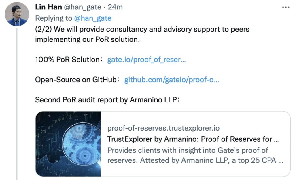 Second PoR audit report by Armanino LLP: https://proof-of-reserves.trustexplorer.io/clients/gate.io