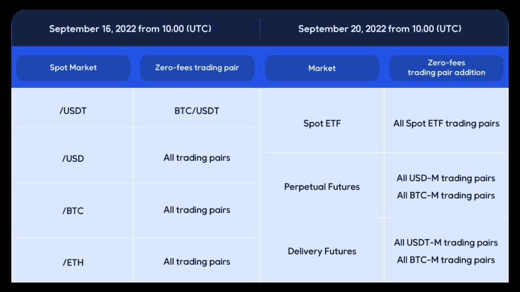 As a gesture of goodwill to millions of users worldwide, maker and taker fees on all spot market USD, BTC, and ETH quote currency trading pairs and BTC/USDT have been completely removed as of September 16 (UTC). As of September 20 at 10:00 (UTC), there will be no fees on all spot ETF pairs, USD-M and BTC-M perpetual futures pairs, USDT-M and BTC-M delivery futures pairs.