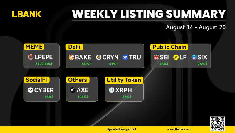 For the week running from August 14-20, LBank listed a total of 10 tokens. These included LadyPepe (LPEPE), a memecoin that rose by an impressive 312,900%. There was also BAKE (up 88% in a week), CRYN, TRU, SEI, LF, SIX, CYBER, AXE, and XRPH, all of which posted significant growth after listing.