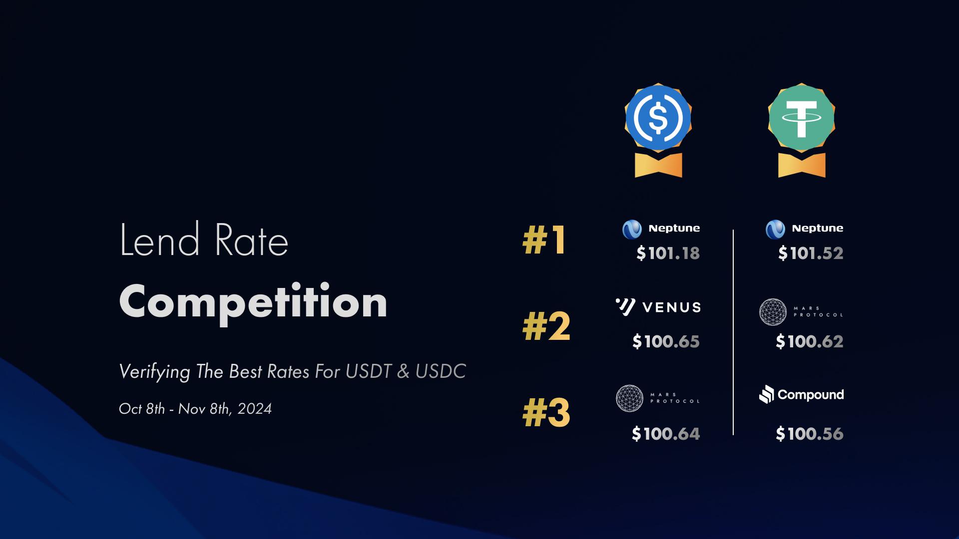 Last month, 100 USDC and 100 USDT each were deposited into 10 platforms including Neptune, and other competitors. The competition study is aimed to determine the performance and user value of the top 10 DeFi lending platforms and can be tracked in real-time on Pulsar: https://app.pulsar.finance/portfolio