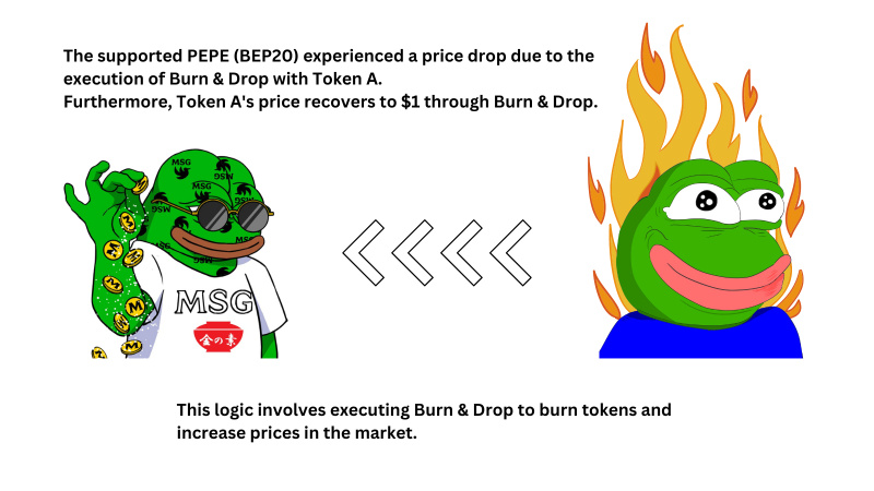 To initiate a Burn & Drop, two types of tokens are required. For example, this could involve a scenario in which Token A is priced at $1 and PEPE (BEP20) is also priced at $1. However, if the price of Token A were to drop to $0.8, Token A holders would have the option to burn their tokens on the Burn & Drop platform, automatically receiving PEPE (BEP20) through an airdrop, and with Token A having been burned, its total supply would decrease.