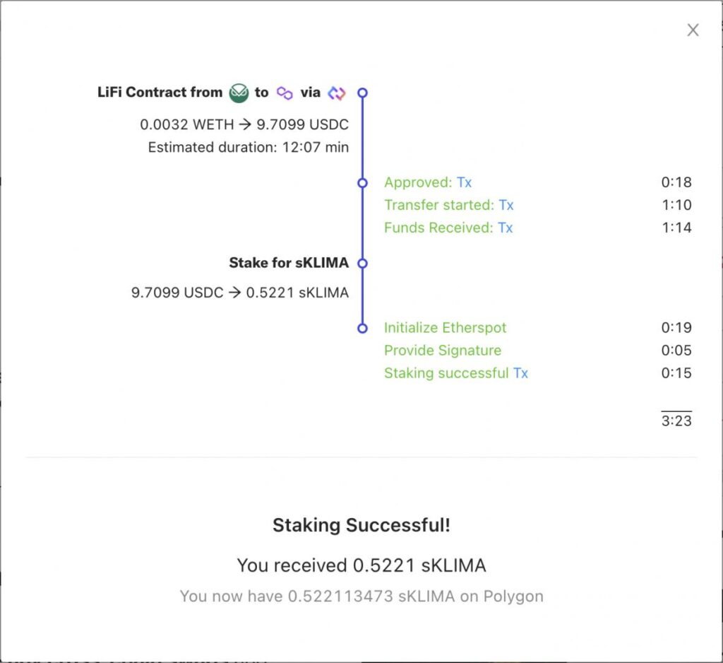- Sign a transaction on Polygon to swap and stake into Klima (2 back to back interactions/signatures).
