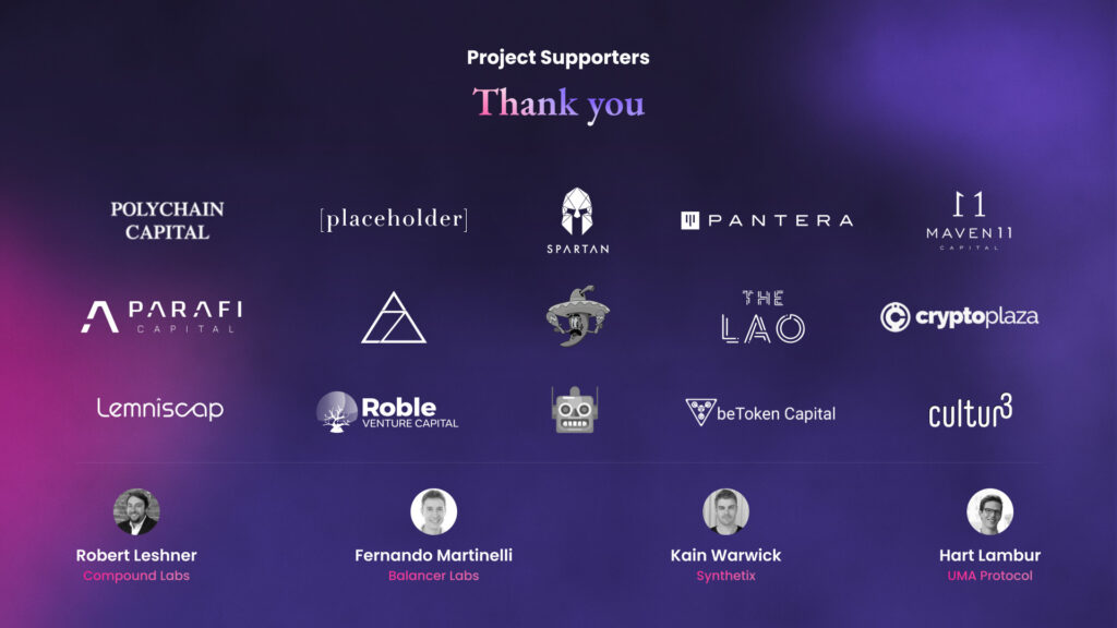The project attracted interest from experienced DeFi parties such as Polychain, Placeholder, Pantera, Maven 11, The LAO, MetaCartelVentures, ParaFi, Spartan, Robert Leshner, and Tarun Chitra, Fernando Martinelli, Synthetix founders, Crypto Plaza, Roble VC, CULTUR3, Lemniscap, Zee Prime, beToken Capital, among other reputed parties in DeFi.