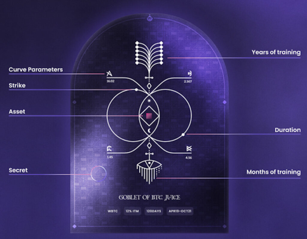 Potion Unlock NFTs commemorate the release of the Lab’s Kelly Machine and its key technical breakthrough: the synthesis of the Kelly Criterion into a bonding curve. To celebrate this, each NFT symbolically and artistically represents a different insurance contract. Various characteristic artifacts are used in each NFT to represent the specific parameters of an insurance contract.