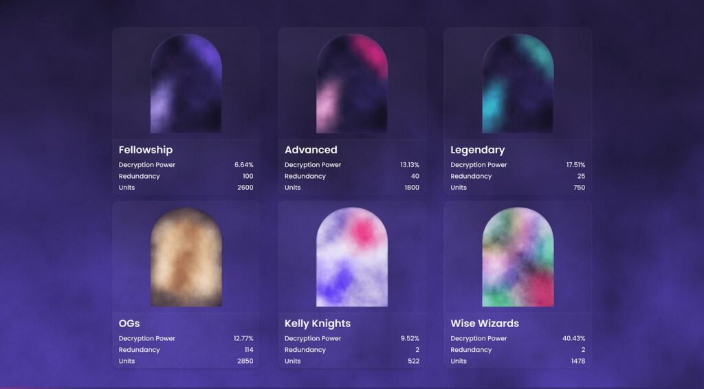 There are 6 NFT types or “rarities” in the game, each with a different “decryption power”, giving the various players different capabilities and powers. Each NFT rarity will also have a different “redundancy” level, so no single holder can block the resolution of the game.