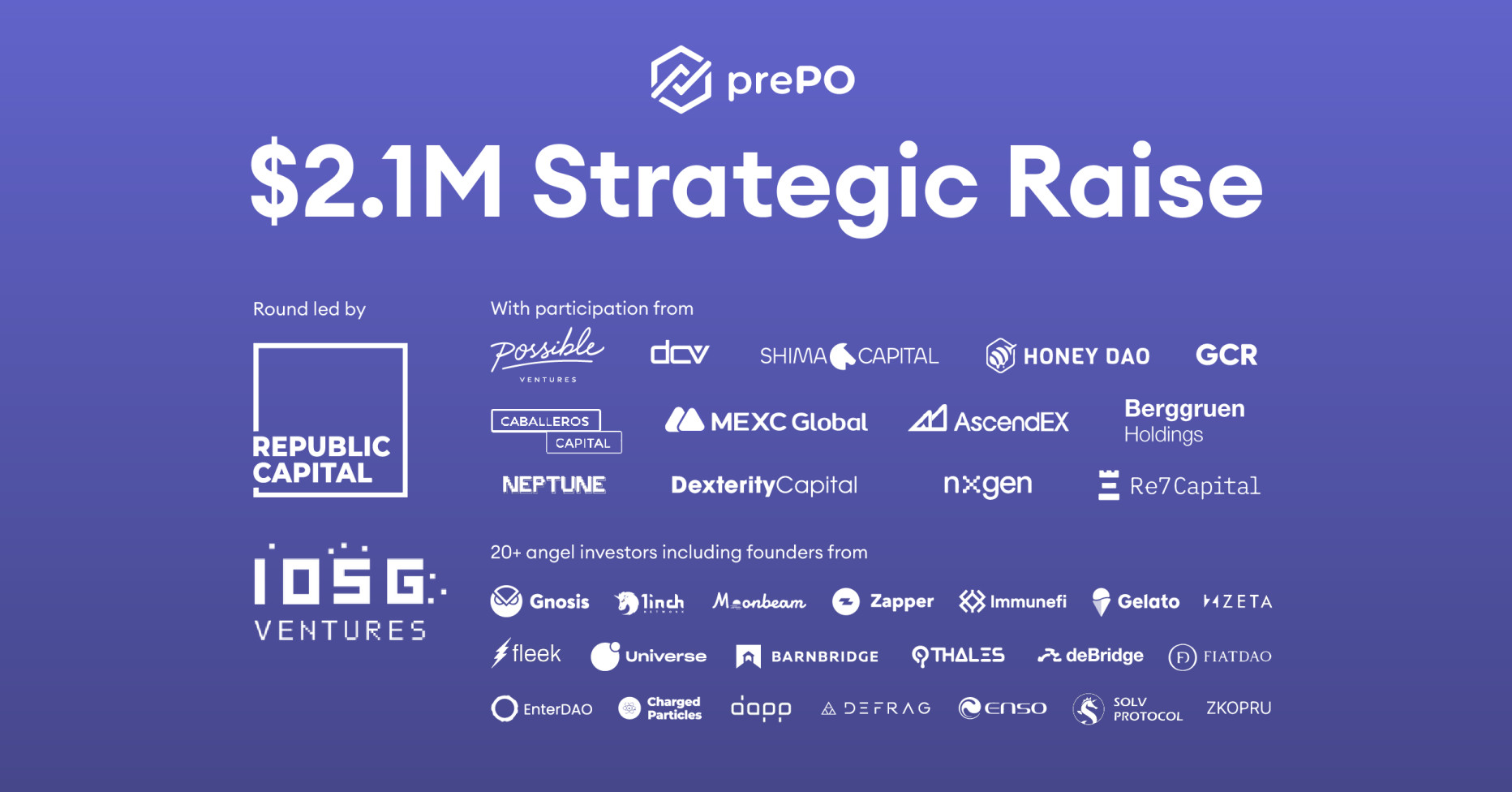 The round was led by Republic Capital and IOSG Ventures, with participants including MEXC, AscendEX, GCR, Shima Capital, Caballeros Capital, Dexterity Capital, HoneyDAO, NeptuneDAO; and founders from Gnosis, 1inch, Moonbeam, Zapper, Gelato, BarnBridge, Zeta, Fleek, Immunefi, deBridge, Thales, Dapp.com; and many others.