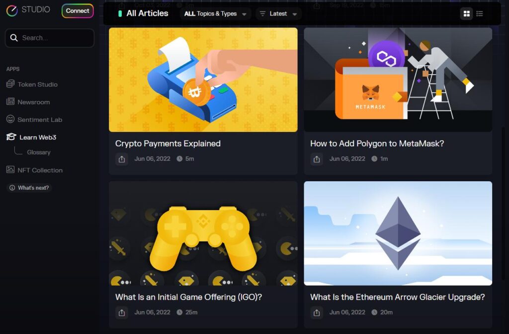 There will be multiple paths and call-to-action portals that will link to relevant educational content throughout Token Studio and Newsroom. While users are viewing their portfolio or favorite lists of watched tokens, prompts will be presented to the user to find out more about the relevant token or news story.