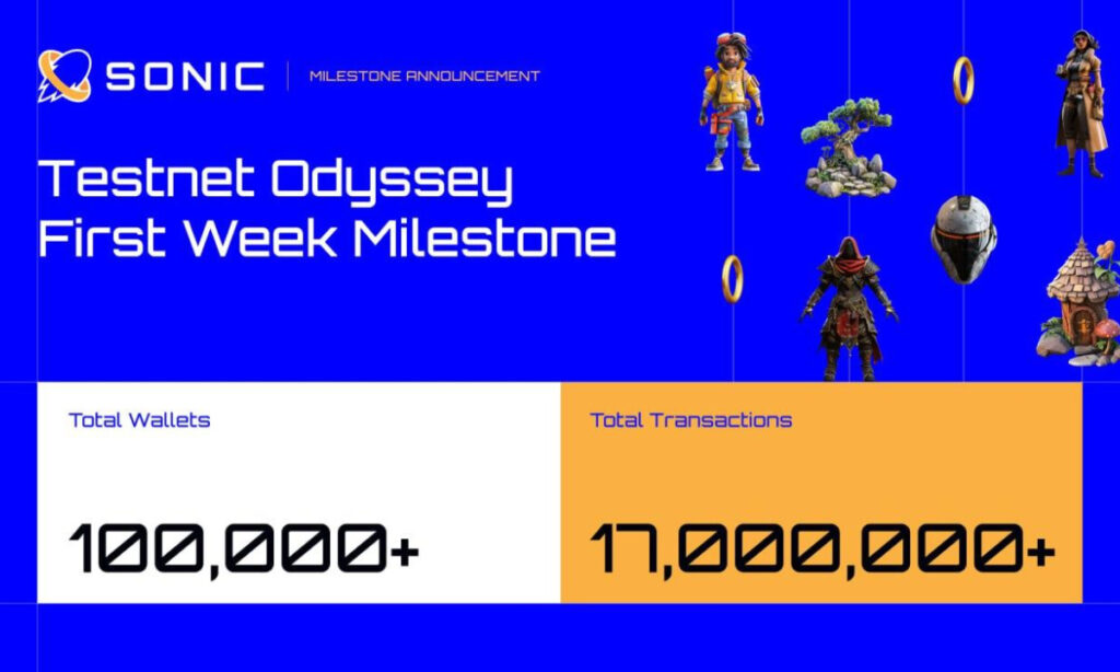 Sonic, the first gaming L2 infrastructure to launch on Solana, has revealed it accrued more than 100,000 unique wallets and processed over 17 million transactions within one week of launching its Sonic Testnet Odyssey.