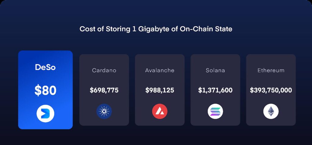 DeSo engineer Piotr Nojszewski explains “Hypersync is a new approach to node synchronization designed for infinite-state blockchains that are orders of magnitude faster than traditional block synchronization.” For example, storing just a 200-character “Tweet” on Ethereum costs $80 and $0.25-$1.00 on Solana, Avalanche, and Polygon. In contrast, storing this on the DeSo blockchain costs 1/1,000th of a penny because of DeSo’s scaling advantages.
