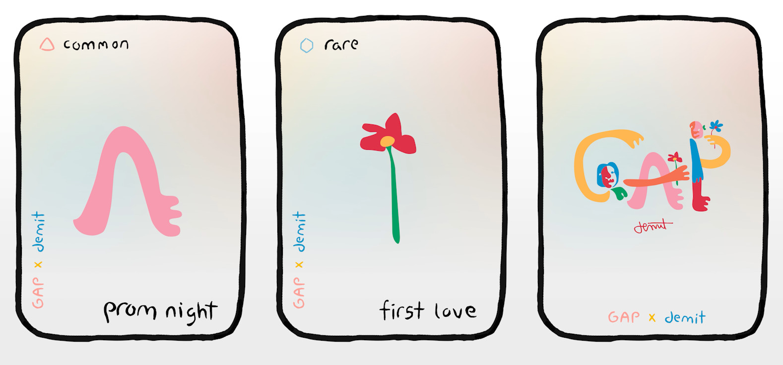 “My work is playful, expressive, and simplistic, yet loaded with emotion,” said Demit Omphroy. “Being able to express myself through a new digital medium and collaborate with Gap, one of the most iconic brands in history, is exciting for me as a creator. I can’t wait to share my first NFT collection with the world.”