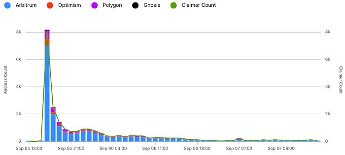 Participants began registering on 17 August, 2023 and continued to do so through 05 September, 2023. At one point, registrations peaked at more than 30,000 users per hour. “This registration velocity broke a long-standing platform record,” said Borda. “Our previous throughput record was 28,000 users per hour with Synthetix in 2017 — we were excited to see that record broken by Connext’s community.”