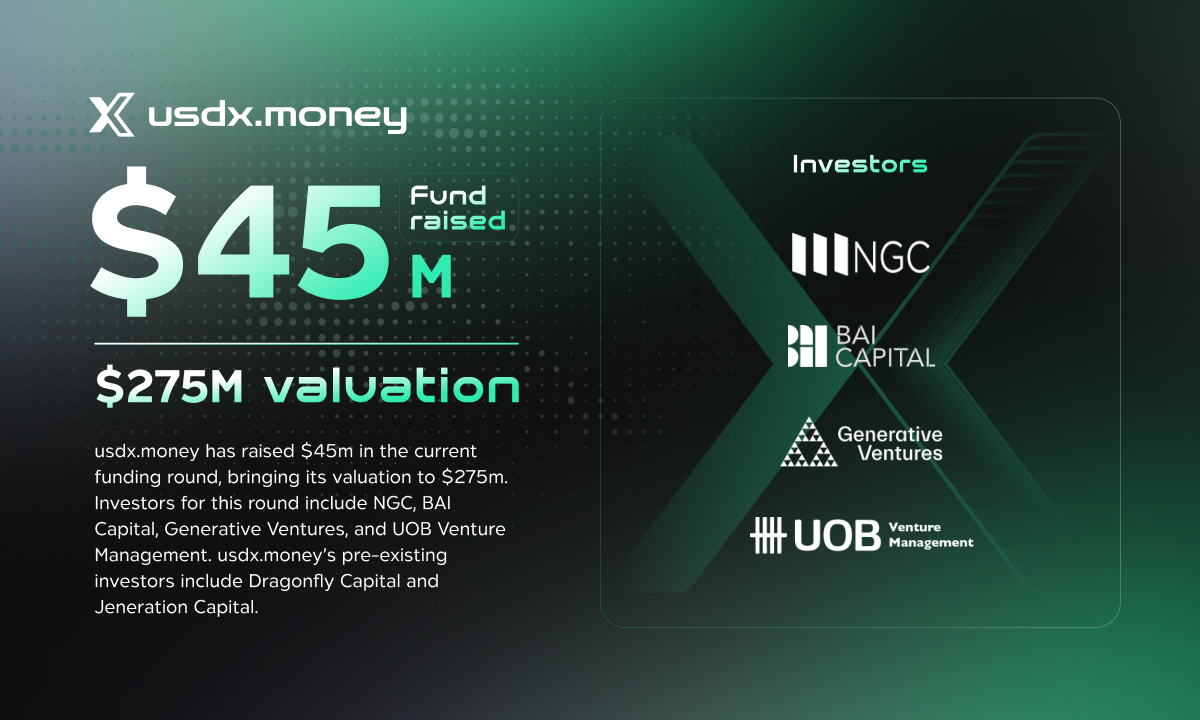 usdx.money, a stablecoin infrastructure project, announced it has raised $45 million in the latest round of financing. The round puts the project’s valuation at $275 million. Investors for this round include NGC, BAI Capital, Generative Ventures, and UOB Venture Management, with a portion of the investments made in the form of warrants. Its pre-existing investors are Dragonfly Capital and Jeneration Capital.