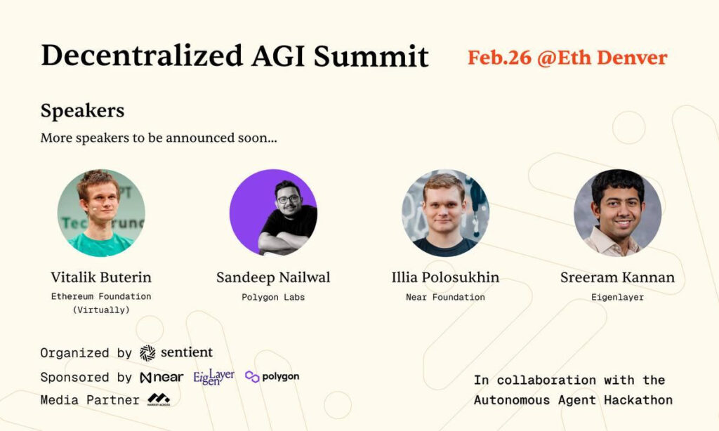 The Decentralized AGI Summit, organized by Sentient and Symbolic Capital, will bring together top thought leaders in Decentralized AI like Vitalik Buterin, Sandeep Nailwal, Illia Polosukhin, and Sreeram Kannan.