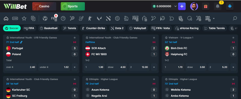 Willbet.io supports betting on various sports, such as soccer, basketball, tennis, and niche games like darts and volleyball. Esports enthusiasts can wager on over 27 titles, including League of Legends, Dota 2, and Counter-Strike, with more than 300 events available for real-time betting. The live betting feature allows users to adjust their bets as events unfold.