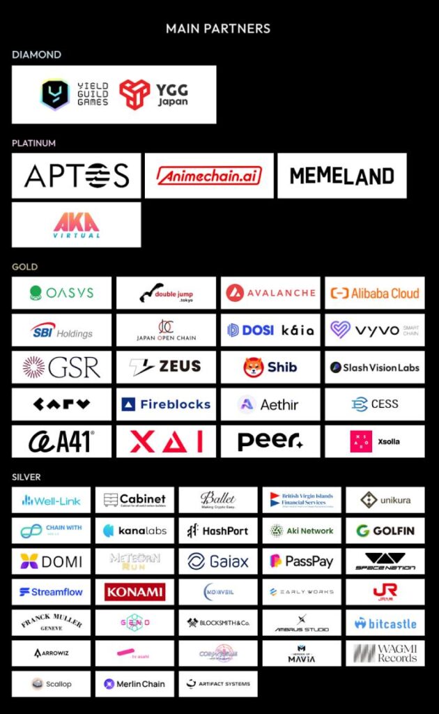 We extend our gratitude to our main partners whose support ensures the success of this monumental event. Our Diamond Sponsor, Yield Guild Games and YGG Japan, has been instrumental in the Web3 Entertainment Zone, showcasing their dedication to the play-and-earn movement. YGG, or Yield Guild Games, is the world’s largest decentralized gaming guild, driving the play-and-earn movement globally, while YGG Japan focuses on the Japanese market, promoting local participation in global play-and-earn games. Our Platinum Sponsors include Aptos, Animechain.ai, AKA Virtual, and Memeland. Gold Sponsors include Oasys, double jump.tokyo, Avalanche, Alibaba Cloud, Japan Open Chain, SBI Holdings, LINE NEXT/DOSI/Kaia, Vyvo Smart Chain, GSR, Zeus Network, Shib.io, Slash Vision Labs, CARV, Fireblocks, Aethir, CESS Network, A41, XAI, Peer, and Xsolla.