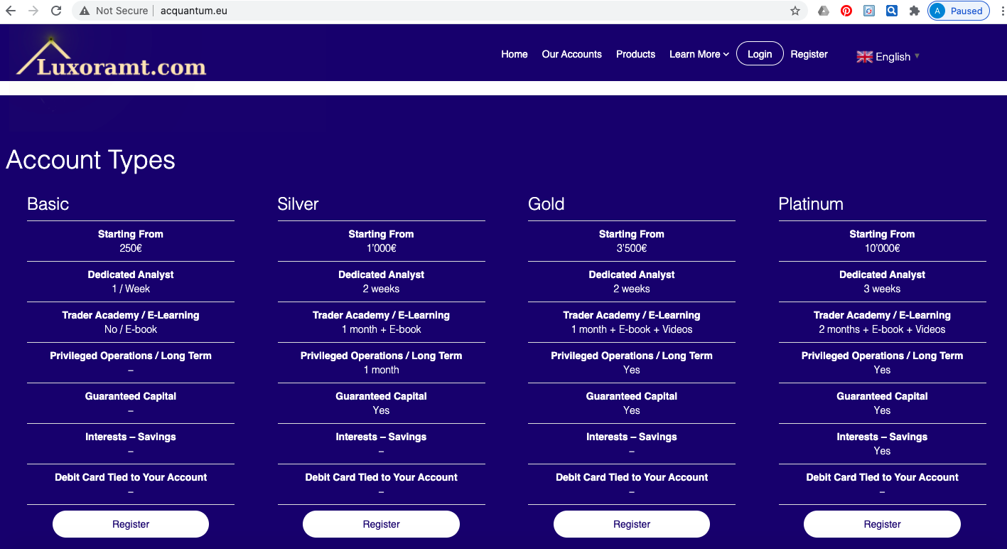 Acquantum seems to be a clear-cut scam. The company that owns and operates this brokerage also owns a twin brokerage by the name of Luxorampt.com. Both the websites look exactly the same, and the legal documents found on Acquantum’s site all bear the name of Luxorampt. In fact, if you enter www.acquantum.eu, you are sent to the Luxorampt site.