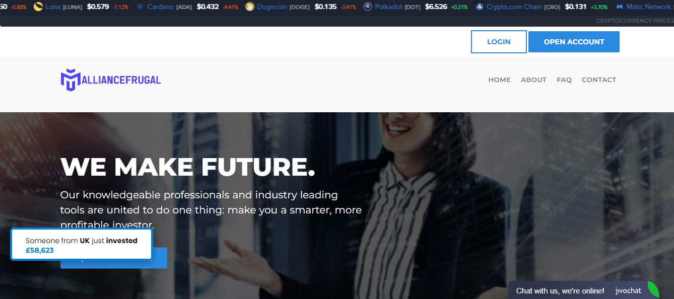 Alliance Frugal does not say anything about their corporate identity or their regulation status on their website. We had to search their website before we were able to find a little bit on information about them on their FAQ page. On that page, the broker claims to be based in the United Kingdom, and that their parent company, alliancefrugal.com LLC is registered here.