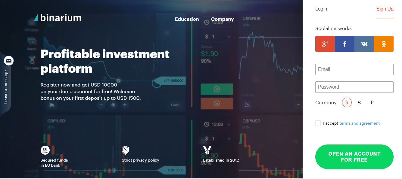 Binarium is a broker that offers trading in binary options via a web-based platform. While the website itself doesn’t really give much information about the account types available, when you sign-up, you get to choose from 5 different account types.