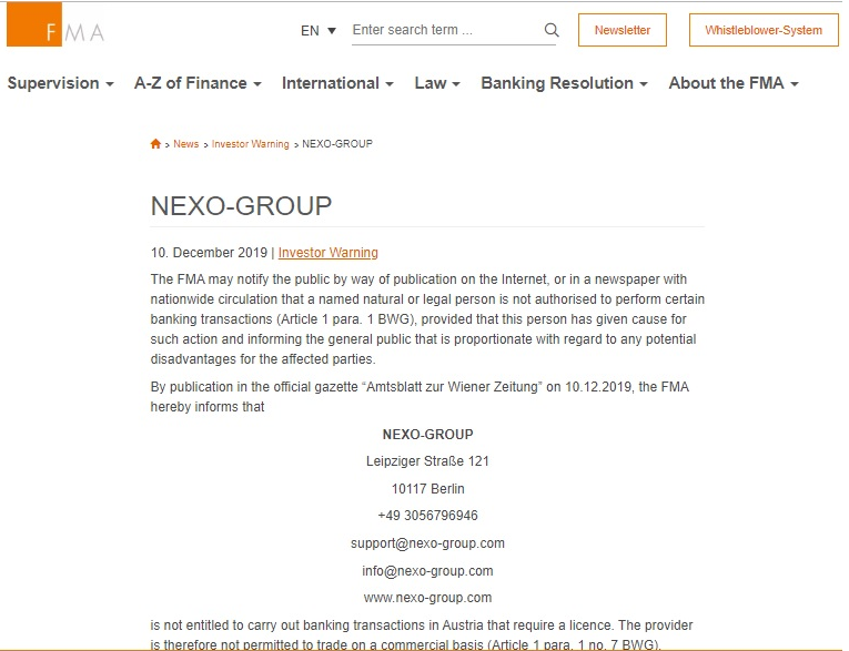 We discovered that Nexo-Group has been blacklisted by the Austrian financial authority, the FMA (Financial Market Authority).