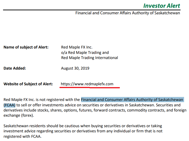 While investigating whether RedMapleFX was regulated, we uncovered another ugly truth. This broker has been blacklisted by the Canadian authorities in two provinces. Both the Ontario Securities Commission (OSC) as well as the Financial and Consumer Affairs Authority of Saskatchewan (FCAA) have issued warnings against this broker.