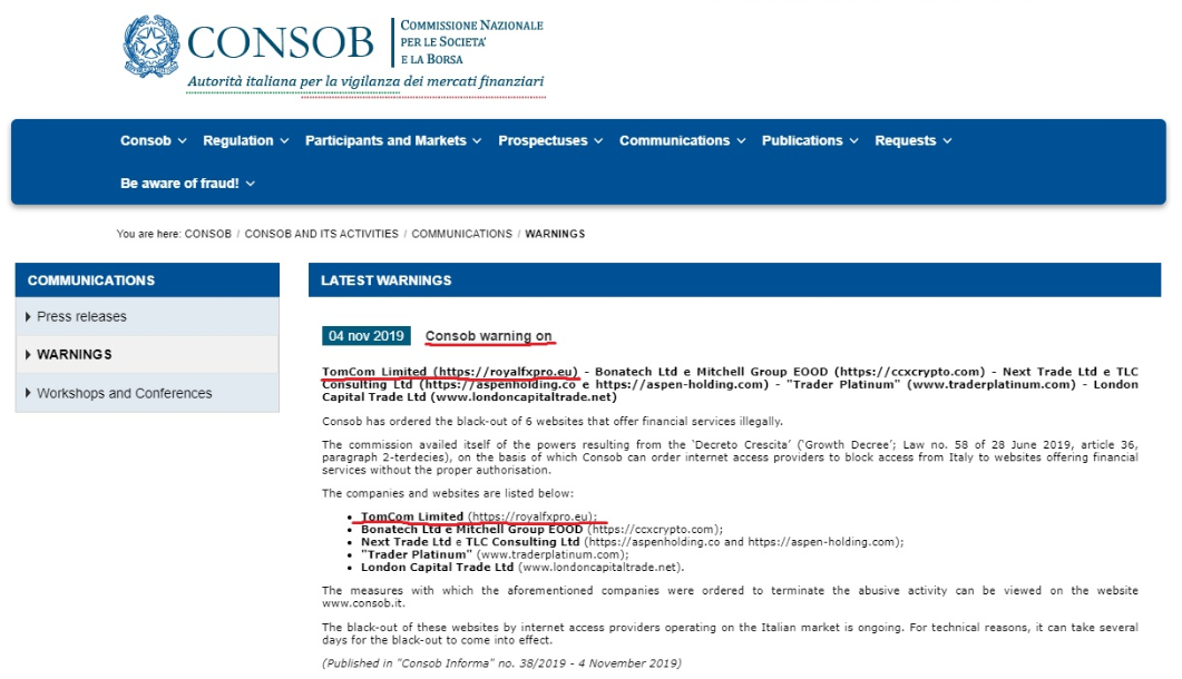 This warning alerts consumers to the fact that RoyalFXPRO and its parent company TomCom Limited have been targeting customers in Italy as well as other EU countries without authorization, and that this brokerage is in all probability a scam.