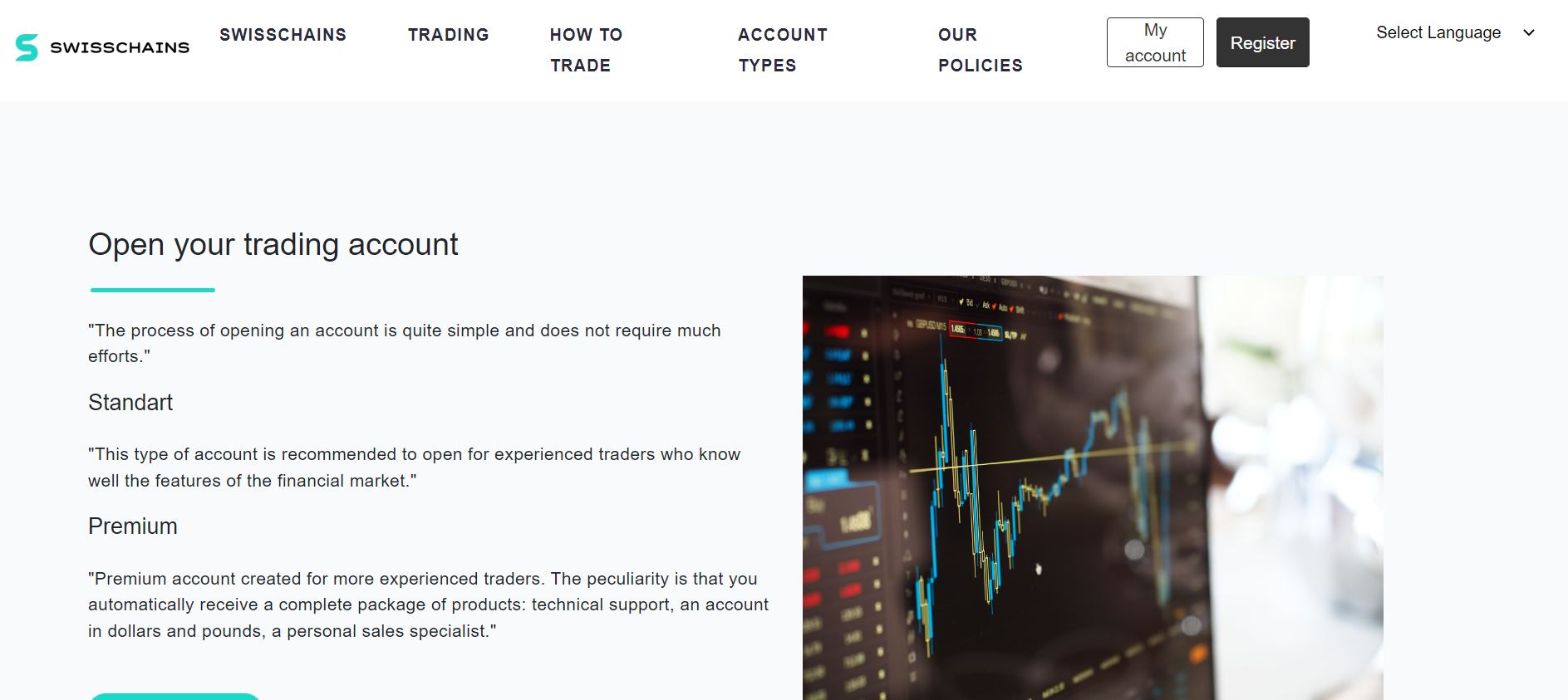 SwissChains offers their clients the following trading accounts:
