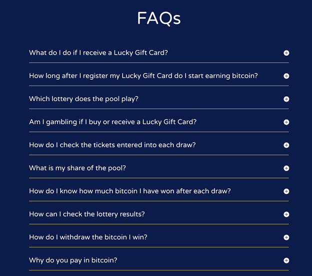 Lucky Gift Cards offers customers a range of support options. The project’s website has an extensive FAQ sheet with common questions and answers. People with questions or concerns can also email the team or Live Chat.